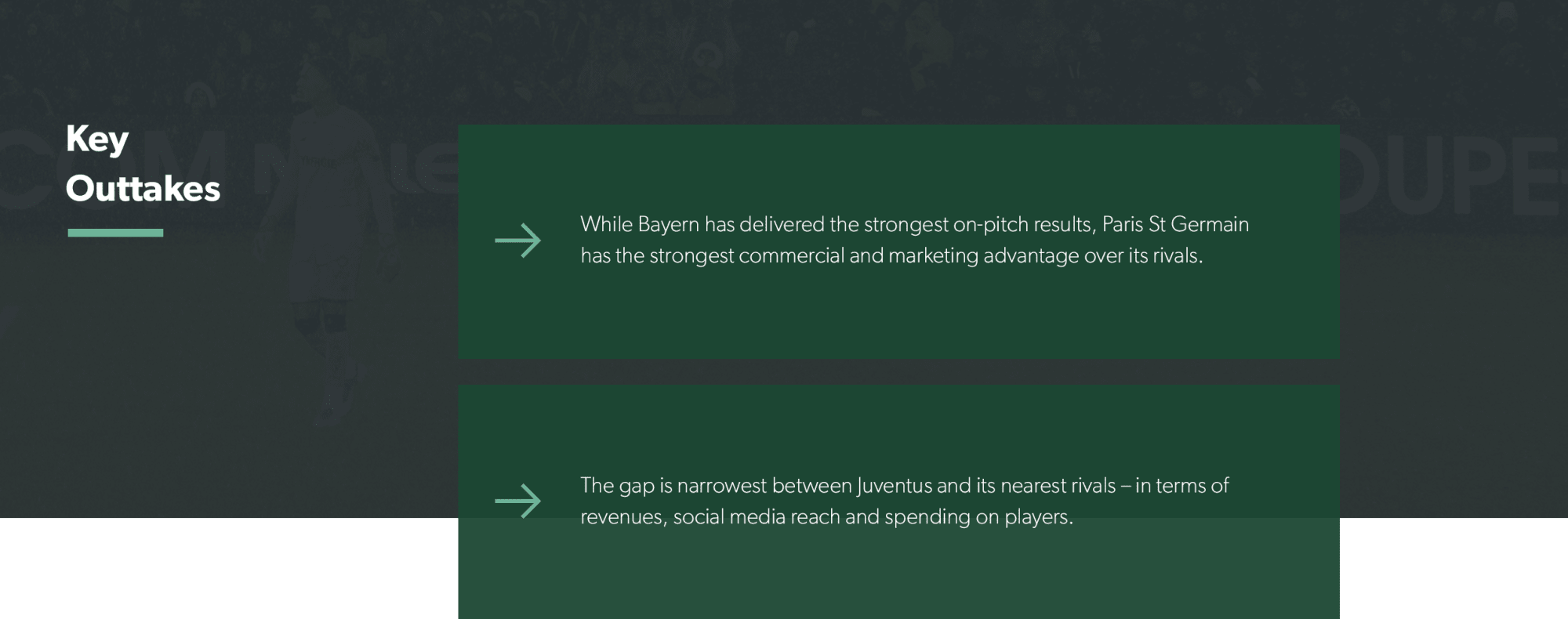 PSG’s lead in matchday (€9m) and broadcasting (€35m) revenues is modest. However, the club enjoys a seemingly unassailable advantage of nearly €400m in commercial revenues, almost 8x those of the next highest club Olympique Lyonnais, much of which comes from highly lucrative sponsorship contracts. Bayern Munich’s key advantage is also in commercial revenues, where the club holds a lead of €130m, over 80% higher than Borussia Dortmund. The clubs are separated by smaller gaps in broadcasting (44%) and matchday (€44m) – although the latter is over twice Dortmund’s matchday revenue despite the latter’s higher capacity and attendance, indicating a significant premium enjoyed in the pricing of – and balance between – ticketing and hospitality. For Juventus, broadcasting represents the biggest revenue advantage at €62m vs. AS Roma, due in part to recent Champions League performances. Commercial revenue is a relatively small €42m ahead of Inter Milan – a modest gap of only 29% when compared to the other two leading clubs.
