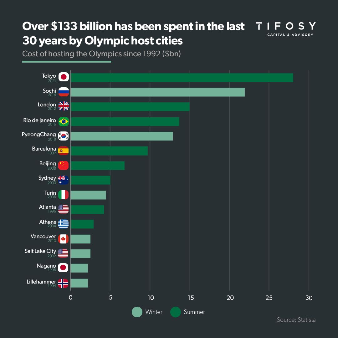 Since 1992, over $130bn has been spent by cities hosting the Summer or Winter Olympics. Tokyo’s 2021 Summer Games, delayed from 2020 due to the Covid-19 pandemic, is estimated to have cost $28bn to host.
