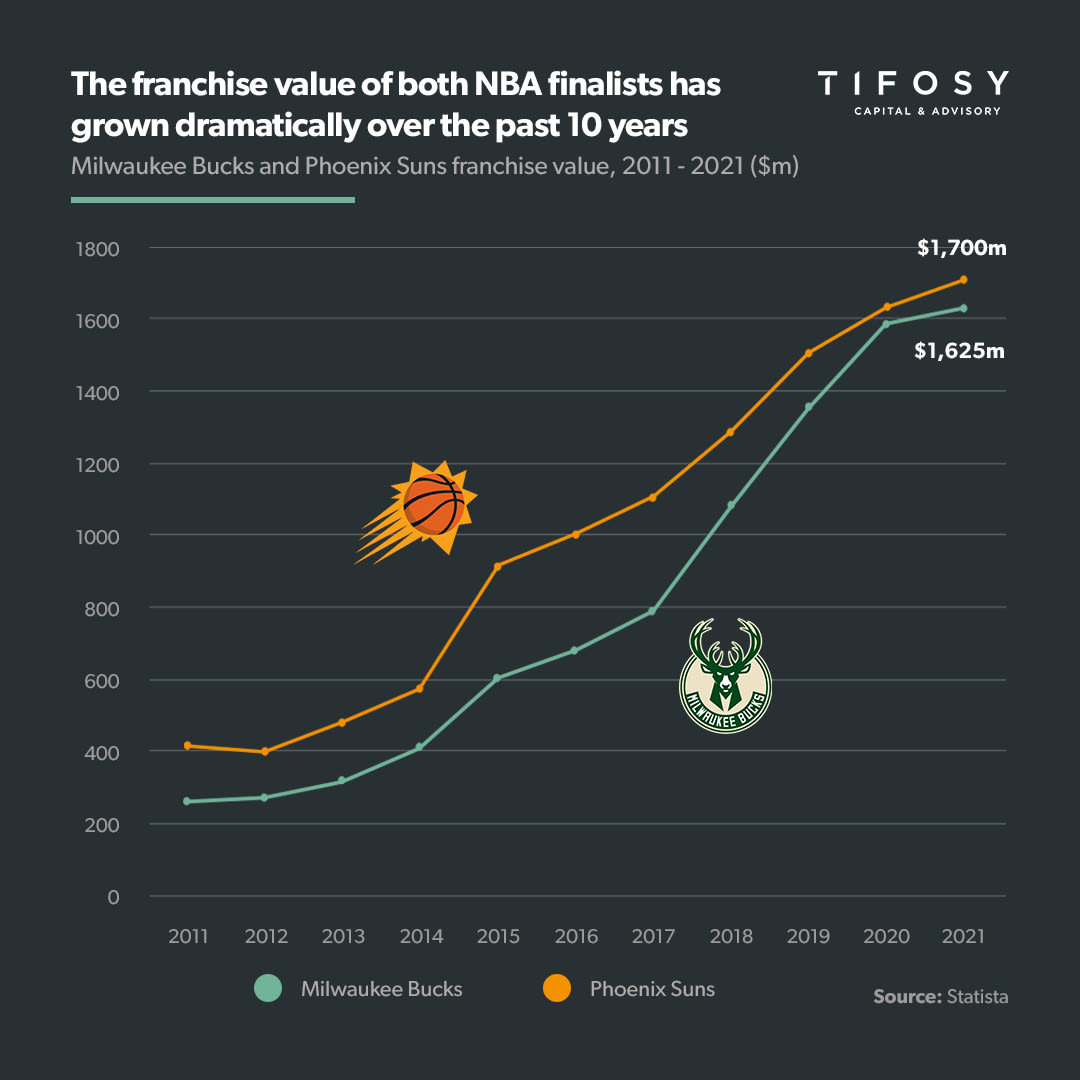 While their finals opponents the Phoenix Suns have a 2021 value of $1,700m, more than 4X its value in 2011 ($411m).