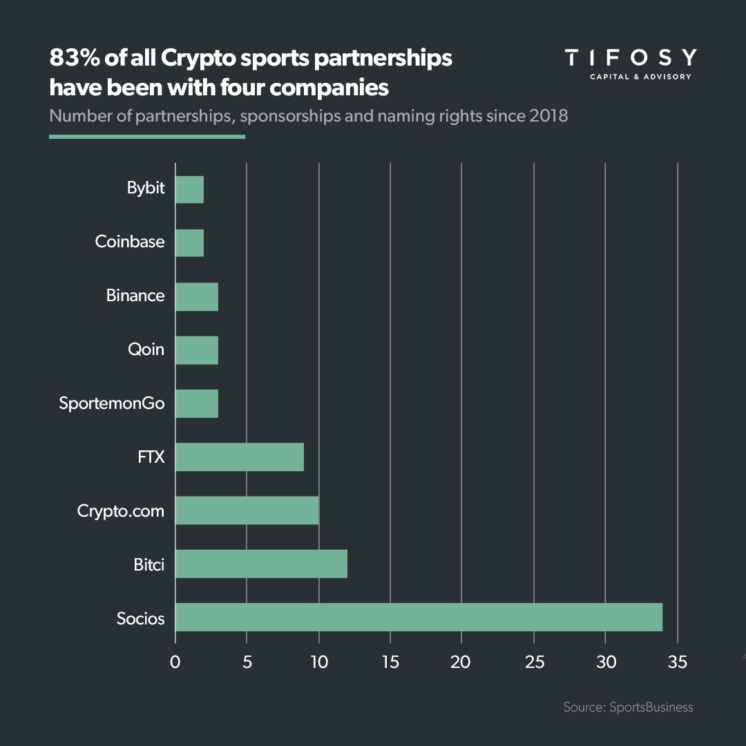 Four brands have accounted for more than 4 in 5 sports #crypto partnerships since 2018, with the top two being #fantoken operators Socios and Bitci, which have agreed partnerships with 48 sports franchises between them.
