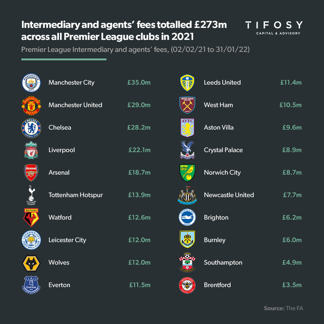 Intermediary and agents' fees totalled £273m across all Premier League clubs in 2021