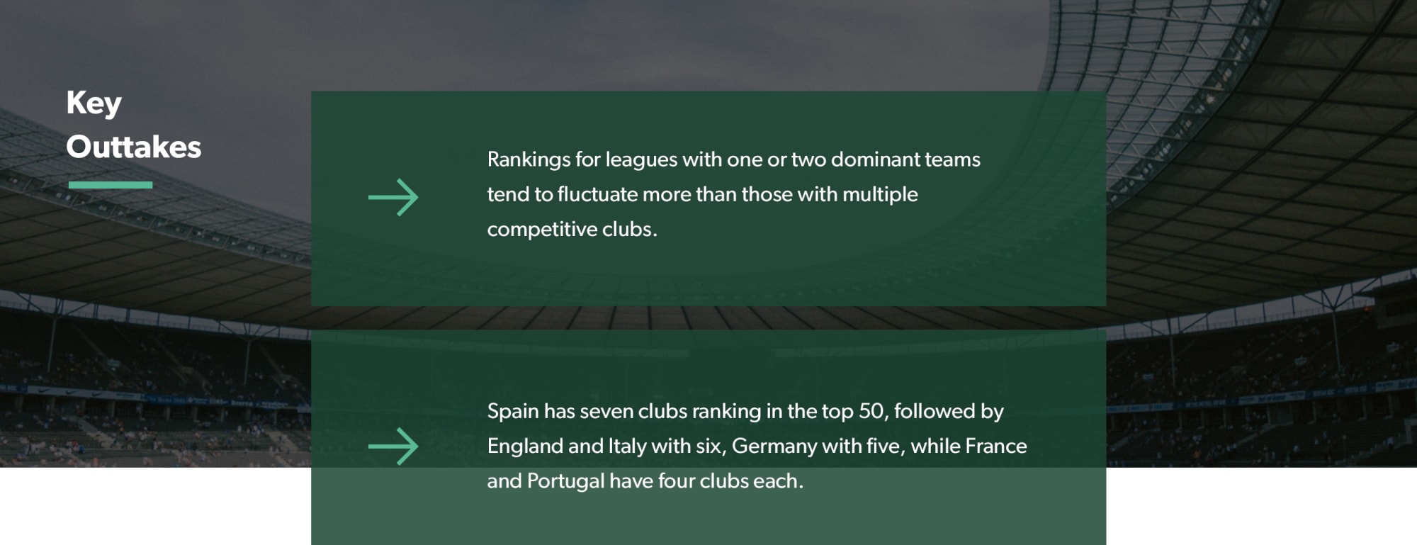 Over the past ten seasons, Spanish teams have accounted for three of the top five ranked clubs with Real Madrid, FC Barcelona, and Atletico Madrid ranking first, third and fourth respectively. Furthermore, Spain has seven clubs ranking in the top 50, followed by England and Italy with six, Germany with five, while France and Portugal provide four clubs each.